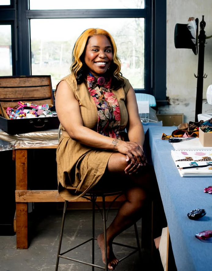 Nisha transforms textile discards into stylish accessories — bow ties, lavallières, and more — keeping thousands of pounds of fabric out of landfills. Each piece is playful, sustainable, and made to be worn with pride!